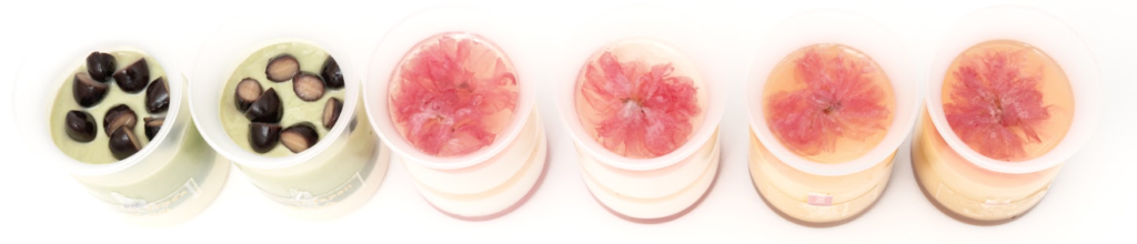 その後、濃いピンク色を残すために塩漬けされ、タマゴを一切使用せずお米を使用して作られた桜ジュレライスブリン3種。